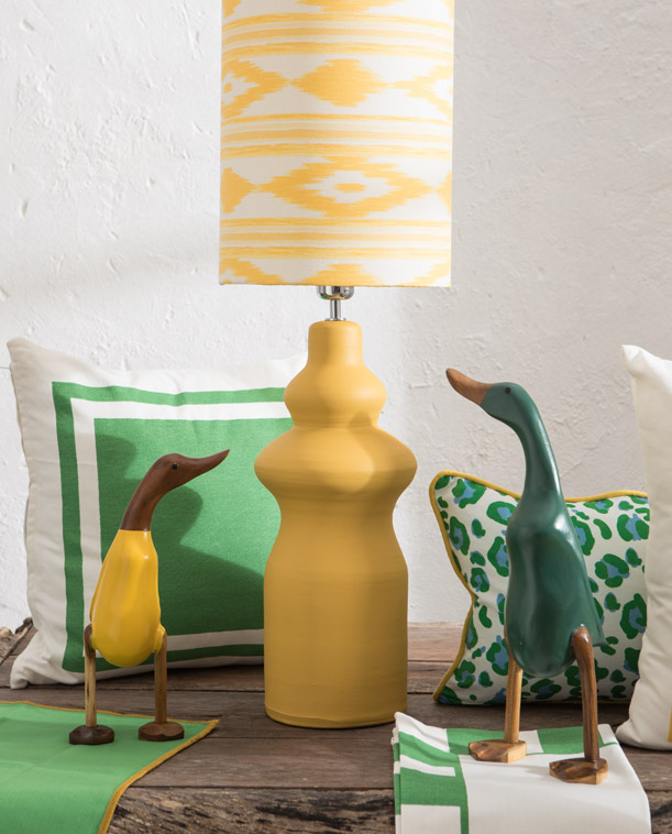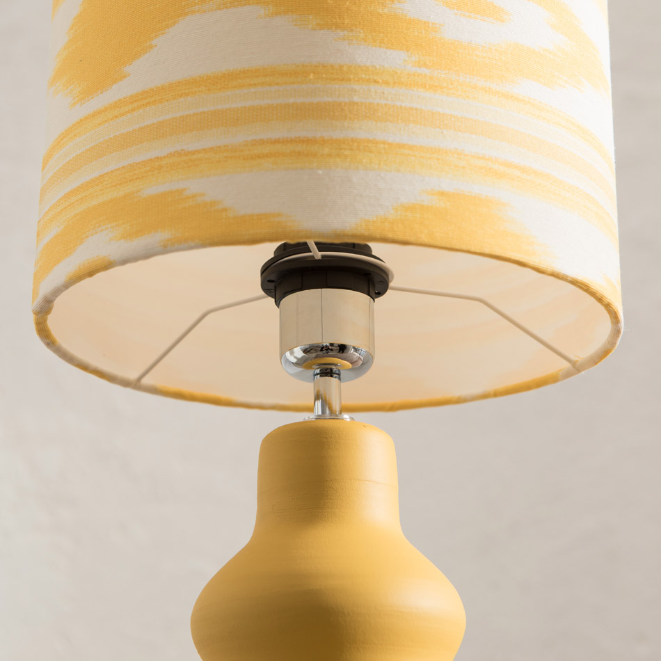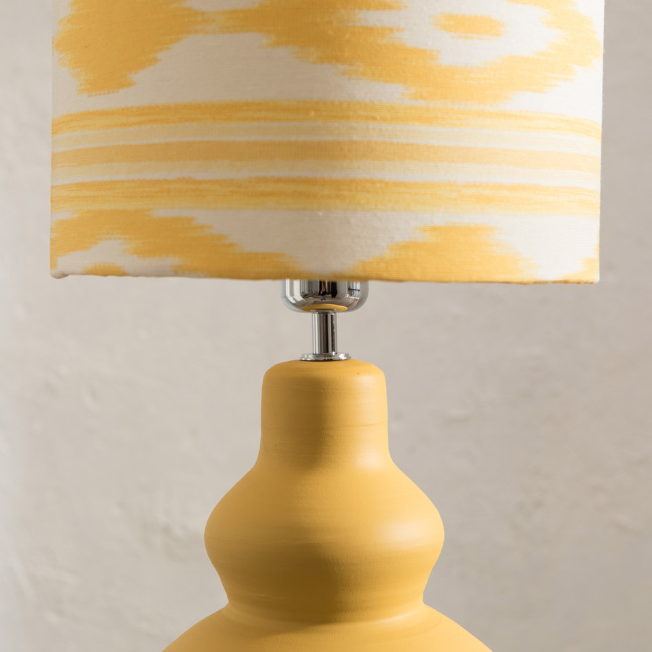 Ceramic lamp base with a yellow finish handmade in Spain. Does not include screen/lampshade. It can be combined with the RAFFIA KNOTS SMALL LAMPSHADE, JALISCO LAMPSHADE, COPE LAMPSHADE, IKATS LAMPSHADES, CACHEMIRE LAMPSHADES.