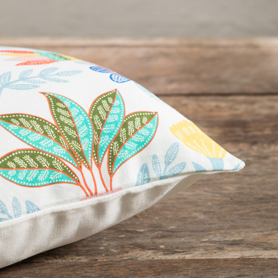 Colorful cushion inspired by tropical flora and fauna in bright colors. Combine it with any plain or pattern cushion from our collections (stripes, checks…) and make of it the accent piece of the room. Includes silicone fiber inner cushion.