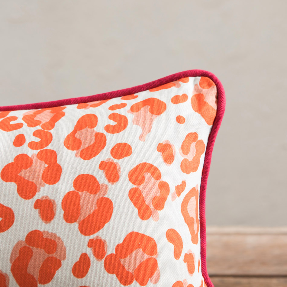 Leopard print cushion in bright colors. Combine it with other patterns or solid colors to create a fun atmosphere with a wild touch.