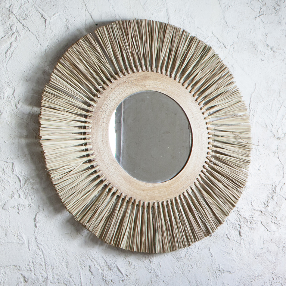 Circular wooden mirror with natural fiber fringes recreating the shape of the sun. Its bohemian and tropical style will make you feel in a relaxed atmosphere.